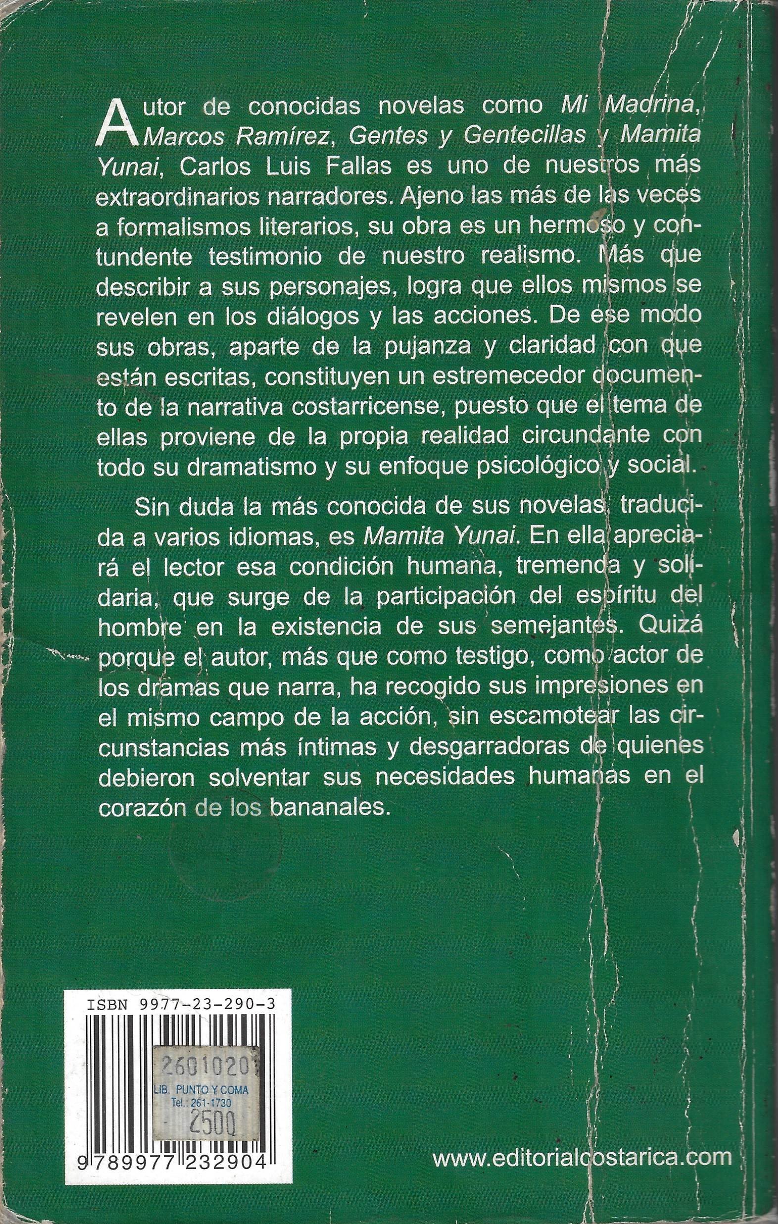 Autor de conocidas novelas como Mi madrina, Marcos Ramírez, Gentes y Gentecillas y Mamita Yunai, Carlos Luis Fallas es uno de nuestros más extraordinarios narradores. Ajeno la más de las veces a formalismos literarios, su obra es un hermoso y contundente testimonio de nuestro realismo. Más que describir a sus personajes, logra que ellos mismos se revelen en los diálogos y las acciones. De ese modo sus obras, aparte de la pujanza y claridad con que están escritas, constituyen un estremecedor documento de la narrativa costarricense, puesto que el tema de ellas proviene de la propia realidad circundante con todo su dramatismo y su enfoque psicológico y social. Sin duda la más conocida de sus novelas, traducida a varios idiomas, es Mamita Yunai. En ella apreciará el lector esa condición humana, tremenda y solidaria, que surge de la participación del espíritu del hombre en la existencia de sus semejantes. Quizá porque el autor, más que como testigo, como actor de los dramas que narra, ha recogido sus impresiones en el mismo campo de la acción, sin escamotear las circunstancias más íntimas y desgarradoras de quienes debieron solventar sus necesidades humanas en el corazón de los bananales.